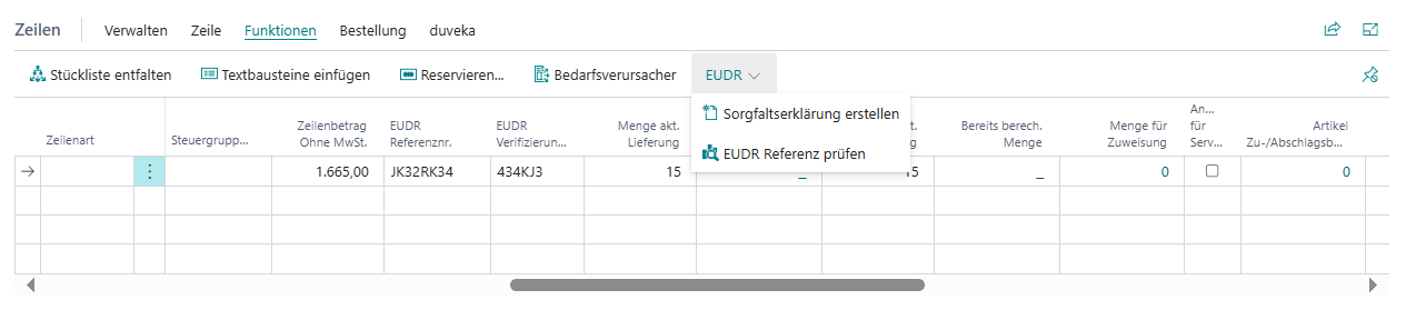 Über das Menü Funktionen → EUDR lassen sich Sorgfaltserklärungen automatisiert erzeugen oder vorhandene Referenzen validieren.